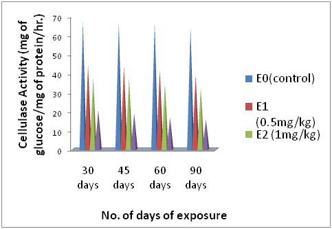 Acccording to the data of (Table 2), (Figure 2) a remarkable drop down change in Cellulase activity in all the groups of earthworms was observed when they were exposed to different concentrations of endosulfan i.e. E1, E2, and E3 except the control group E0 over the period of 90 days of experiment. As shown in (Table 2), (Figure 2) the earthworms of group E1 i.e. 0.5mg/kg endosulfan exhibited an initial decline in Cellulase activity after 30 days from the control value of 67.13±0.46 to 44.16±2.19 and at the dose of 1mg/kg there was decrease in mean Cellulase activity of earthworms from control value of 67.13±0.46 to 37.78±0.95 (mg of glucose/mg of protein/hr). Similarly, as evident from the data of (Table 2), (Figure 2) the highest dose of 2mg/kg brought down the mean Cellulase activity from control value of 67.13±0.46 to 20.77±0.29 after 30 days of exposure. Further decline in the values after 90 days of exposure at all the three doses of endosulfan i.e. 0.5,1 and 2mg/kg were observed as 39.12±0.66, 32.45±1.07 and 15.93±0.55 (mg of glucose/mg of protein/hr). Whereas no significant change in the control values were observed during the entire period of experiment.