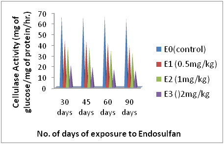 Figure 2 Showing the cellulase activity (mg of glucose/mg of protein/hr.) of earthworms during 30, 45, 60 and 90 days of exposure to different concentrations of Endosulfan.