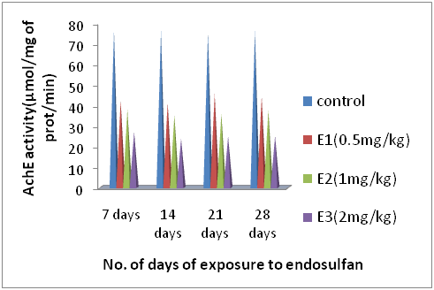 Figure 3 Showing the change AchE enzyme activity (µmol/mg of protein/min.) of earthworms during 7, 14, 21 and 28 days of exposure to different concentrations of endosulfan with well matched control earthworms.