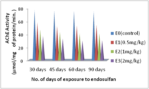 Table 2 Showing the AchE activity (µmoles/mg of protein/min.) of earthworms during 30, 45, 60 and 90 days of exposure to different concentrations of endosulfan (mean±S.E where n = 9)