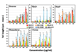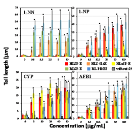 Figures 1-5 shows the length of the comet tail for each pro-mutagen in the presence of five kinds of S9, and without any metabolic system. Experimental data are summarized qualitatively in Figures 6-10. At the selected pro-mutagen concentrations, cell viability was never lower than 70% (data are not shown) and any pro-mutagens did not increase tail length without any metabolic system. With CYP-induced rat liver S9 (RL-PB/BF), all the studied pro-mutagens, except phenacetin, increased tail length significantly. Under RLSP-E, pyrene, IQ, MeIQ, and 1-NP, in addition to phenacetin, did not increase tail length significantly (Figure 6). Phenacetin, in contrast, yielded increased tail length in the presence of pooled human liver S9 HLSP-E (Figure 7). With HLSP-E, however, three pro-mutagens (B[a]A, 1-AP, and 1-NN) showing increased tail length with RL-PB/BF did not show (Figure 8). With HLSP-E or HLSP-014E, however, two pro-mutagens (1-AP, and 1-NN) out of those five showed increased tail length (Figure 7). Although CYP1A2, CYP2D6, and CYP3A4 were more than twice as active in HLS-014E than in HLSP-E (Table 3), five pro-mutagens (pyrene, B[a]P, 2-AA, IQ, and MeIQ) increased tail length with HLSP-E but not with HLS-014E (Figure 9). On the other hand, only two (1-AP and 1-NN) increased tail length with HLSP-014E but not with HLSP-E (Figure 9). The activity of most CYPs were far lower in human lung S9 (HLuSP-E) than human liver S9 (HLS-014E and HLSP-E) (Table 3). Although many pro-mutagens increased tail length with the human liver S9 but not the human lung S9, 1-AP and pyrene increased tail length with the human lung S9 but not with the human liver S9 (Figure 10).