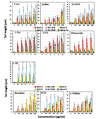Figure 2 Comet assay with aromatic amines in the presence of human and rat tissue S9s and a control. Comet slides were prepared immediately after the exposure to each aromatic amines for 4h. The error bars indicate standard deviation of the mean of three independent trials. *Significant difference from untreated control: p<0.05.
