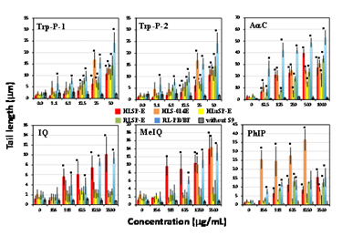 Figure 5 Comet assay with nitro compounds and other pro-mutagens in the presence of human and rat tissue S9s and a control. Comet slides were prepared immediately after the exposure to each nitro compounds and other pro-mutagens for 4h. The error bars indicate standard deviation of the mean of three independent trials. *Significant difference from untreated control: p<0.05.