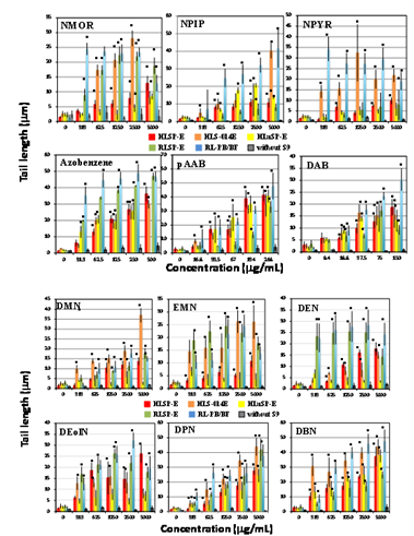 Figure 4 Comet assay with dialkyl N-nitrosoamines and azo dyes in the presence of human and rat tissue S9s and a control. Comet slides were prepared immediately after the exposure to each dialkyl N-nitrosoamines and azo dyes for 4h. The error bars indicate standard deviation of the mean of three independent trials. *Significant difference from untreated control: p<0.05.
