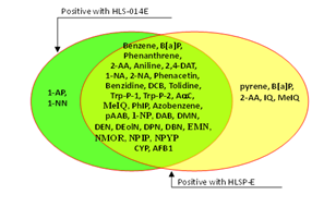 The level of CYP activity in human liver can be influenced by various life-style factors, including cigarette consumption.5 A possible explanation for the higher activity of CYP3A4 in the liver S9 from one human donor (HLS-014E, Table 3) is 10 years’ of enzyme induction by anti-asthma agents.5 Because of such great individual differences in CYP activity, liver S9 from one donor could not represent all human liver S9. It is also not likely that a pooled human liver S9 fraction, such as HLSP-E, which was prepared from a pool of 15 donors can represent all human liver S9. The use of such a pooled preparation, however, might minimize individual differences. For 5 pro-mutagens, discrepant results were obtained with two human liver S9’s, i.e., 2 chemicals (1-AP and 1-NN) were positive with HLS-014E but negative with HLSP-E, and 4 (pyrene, B[a]P, 2-AA, and MeIQ) were positive with HLSP-E but were negative with HLS-014E (Figure 5). So we believe that HLS-014E, which has exceptionally high CYP3A4 activity, activated a greater variety of pro-mutagens than HLSP-E. In contrast, human lung S9, with far lower CYP activity, activated fewer pro-mutagens than human liver S9. HLuSP-E did not activate benzene, DMN, EMN, and DEolN, which are activated by CYP2E1,13–15 that can be explained by the lack of CYP2E1 activity in HLuSP-E.