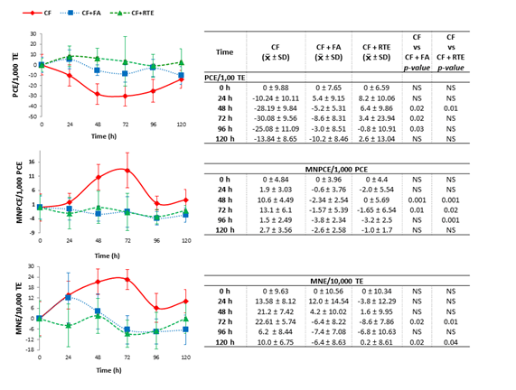Mice were treated with CP in the presence and the absence of 100mg/kg of RTE or 0.06mg/kg of FA during five days (Figure 1). The group who received RTE 100mg/kg during five days simultaneously with 50 mg/kg dose of CP divided in two days showed a minor decrement of the proportion of PCE compared with the group who received CP, this difference was significant at 48 hours of sampling (P=0.01). It was observed a significant decrease in the number of MNPCE (P=0.001) at 48 and 96 hours in the group who received RTE and CP compared with the group that received CP alone. In addition, this group presents a smaller increase in MNE frequency that the CP group. This difference was significant at 72 and 120 hours (Figure 1). In addition, the group receiving the dose of CP and FA presented a minor decrease in the proportion of PCE and a minor increase in MNE and MNPCE frequency in comparison to the group that receives CP (Figure 1). In relation to the proportion of PCE and MNE or MNPCE frequency, no statistical difference was found between the groups of CP+FA and CP+RTE.