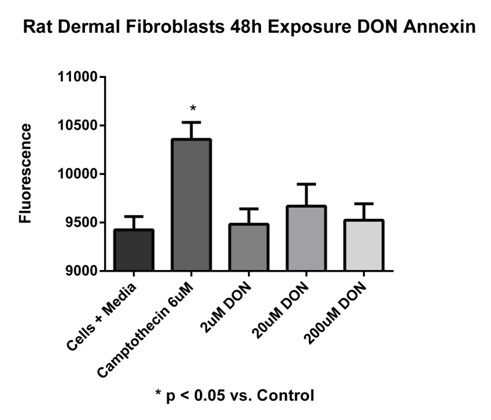 Rat dermal fibroblast cells exposed to DON concentrations of 2, 20, and 200 µM for 48 hours continuous exposure. Media with cells 9424.20 ± 138.5 ru; cells with camptothecin (6µM) 10356.7 ± 175.4 ru; 2µM DON 9483.2 ± 158.4 ru; 20µM DON 9669.3 ± 225.3 ru; 200µM DON 9524.7 ± 169.8 ru. No significant difference was noted except for the positive control camptothecin (*p < 0.05 vs. control). Fluorescence were read at 485nm excitation/535nm emission. Data reported as mean ± sem. N = 7 per group.