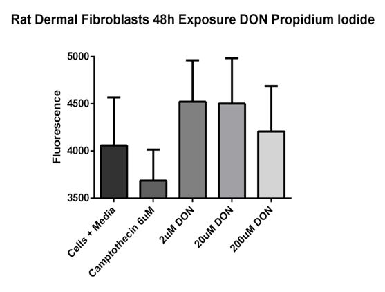 Rat dermal fibroblast cells were exposed to DON concentrations of 2, 20, and 200 µM or 6µM camptothecin for 48 hours. Cells in media 4058.8 ± 180.2 ru; camptothecin (6µM) 3686.6 ± 116.1 ru; 2µM DON 4522.1 ± 155.3 ru; 20µM DON 4502.0 ± 171.1 ru; 200µM DON 4208.7 ± 169.4 ru. No significant differences were noted. Fluorescence were read at 485nm excitation/535nm emission. Data reported as mean ± sem. N = 7 per group.