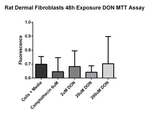 Rat dermal fibroblast cells were exposed to DON concentrations of 2, 20, and 200 µM and 6 µM camptothecin for 48 hours. MTT was added to the cells and the absorbance was read. MTT is used to determine mitochondrial activity. Cells in media 0.69 ± 0.03; camptothecin (6µM) treated cells 0.64 ± 0.05; 2µM DON 0.68 ± 0.06; 20 µM DON 0.64 ± 0.02; 200 µM DON 0.70 ± 0.10. No significant differences noted. Data reported as mean ± sem. Fluorescence were read at 485nm excitation/535nm emission. N = 7 per group.