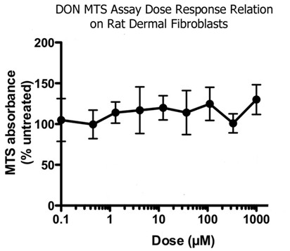 Rat dermal fibroblast cells were exposed to DON concentrations of 0, 0.02, 0.05, 0.15, 0.46, 1.4, 4, 12, 37, 111, 333, and 1000 µM for 48 hours. DON 0.001µM was set as an absorbance percentage of 100.00%. No statistical significance was noted with percentages ranging from 87.9% (0.015 µM DON) to 130.0% (1000.0 µM DON). Absorbance were read at 485nm excitation/535nm emission. Data reported as mean ± sem. N = 4 per group.
