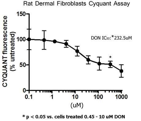 Figure 5 Cell proliferation was analyzed using the CyQUANT® assay. The CyQUANT® absorbance percentage was set at 100% for the rat fibroblast cells treated with 0.10 µM DON. No statistical differences were observed from cells treated with 0.45-10 µM DON. At 30 µM DON, CyQUANT® absorbance was reduced to 77.1%. Further reductions (60.0-51.3%) in CyQUANT® absorbance occurred at 37-333 µM DON. The greatest reduction (38.2%) in CyQUANT® absorbance occurred at 1000 µM DON. The IC50 is 232.5 µM. *p< 0.05 vs cells treated with 0.45-10 µM DON. Data reported as mean ± sem. Fluorescence were read at 480nm excitation/520nm emission. N = 4 per group.