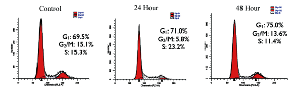 Utilizing flow cytometry, the population of cell replication states can be analyzed. This occurs by treating cells with a nucleic acid intercalating fluorescent dye, then analyzing the fluorescence properties of each cell in the population. Quiescent and G1 cells have one copy of DNA and will have one times (1X) the fluorescence intensity. Cells in G2/M phase of the cell cycle have two copies of DNA and have two times (2X) the intensity. Cells in S phase are synthesizing DNA and have fluorescence values between the 1X and 2X intensity. The flow cytometry control data for the G1 phase was 69.5%; the G2/M phases were 15.1%, and the S phase 15.3%. Cells incubated in DON (232.5µM) for 24 hour were 71.0% in G1 phase, 5.8% for G2/M phases, and S phase at 23.2%. At 48 hours of DON exposure, cells in G1 phase were 75.0%, 13.6% for G2/M phases, and 11.4% for S phase.23 For all groups no sub-G1 peak was observed indicating no apoptosis, in spite of longer exposure times to DON. Furthermore, cell cycle phase distribution is similar between controls and DON treated cells (Figure 6). These data support the previous annexin and propidium iodide experiments revealing no apoptosis or necrosis respectively.