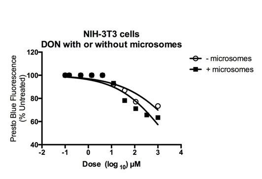 Using a NIH-3T3 cell line, the following treatment groups were analyzed; DON and no microsomes, DON with microsomes, and untreated cells. Two 30µL aliquots of pooled human liver microsomes (Invitrogen, Grand Island, NY) were thawed on ice. Nicotinamide adenine dinucleotide phosphate (NADPH) (10mM) was added to pre-warmed (37°C) 100mM phosphate buffer (pH 7.0) and gently mixed. In two microcentrifuge tubes, 100mM sodium phosphate buffer, 10mM NADPH and 33.3mM DON were added into the tubes. In a third microcentrifuge tube, only 100mM sodium phosphate buffer and 10mM NADPH were added into the tube. Tubes were pre- incubated for five minutes at 37°C. Microsomes were added to each of the tubes, vortexed briefly and incubated for 20 minutes at 37°C. After the incubation period, the tubes were centrifuged (13,000 RPM) for five minutes at room temperature. The supernatant was added to each of four wells in a 96-well place. The supernatant was geometrically diluted in a 1:3 concentration five times in Opti-MEM to generate the dose-response curve (see CyQuant assay for specific incubation times and reagents). IC50 values were calculated using nonlinear regression dose-response analysis (variable slope) with Prism 6.x Software (Graphpad, San Diego CA).