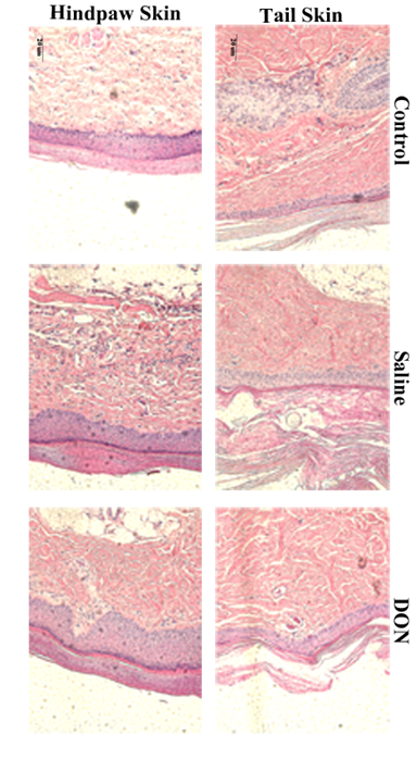 HarlanSprague-Dawley rats, weighing between 250-350grams, were anesthetized with 5% isoflurane and oxygen (3L/min), in a plastic induction chamber, until mobility ceased. A nose cone was utilized to deliver maintenance anesthesia (isoflurane 2-3%, O2 1.5L/min). Tails were measured to determine the midpoint of the proximal third of the tail. The proximal tails and right hind paws of the rats were cleaned using povidone iodine for disinfection. Control animals were naïve rats that received 50µl (0.05ml) sterile saline (0.9%) into the tails and right hind paws. The experimental animals received 50µl (0.05ml) DON (10mM) injections made into the midpoint of the proximal portion of the tail and into the plantar aspect of the right hind paw. At 24 hours post-injection, animals were killed via CO2 asphyxiation and decapitation. Tissue was dissected from the area of injection (tail and right hind paw) and placed in 10% neutral buffered formalin, pH 7.4, for preservation. Samples were processed by Precision Histology Lab Inc. (Oklahoma City, Oklahoma) for hematoxylin eosin staining of paraffin embedded sections.
