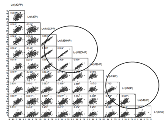 Figure 1 Correlations between phthalate metabolites and bisphenol A in urine from pregnant Mexican women (n =290) on a logarithmic scale. Values correspond to Pearson correlations. *p < 0.05