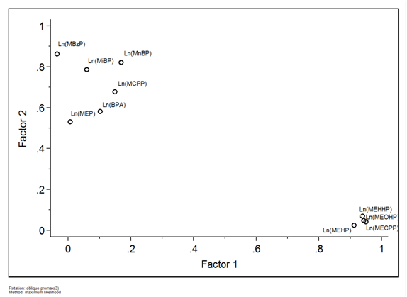 Table 3 Correlations between rotated common factors and the concentrations of phthalate metabolites and bisphenol A in urine from pregnant Mexican women (n=290)