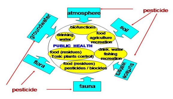 Pesticides are chemical substances that are deliberately applied mainly in agro ecosystems but reach natural ecosystems through precipitation, drift and runoff. Due to often unavoidable interactions between natural ecosystems and human activities (Figure 1) they pose a profound risk to public health (Figure 1).