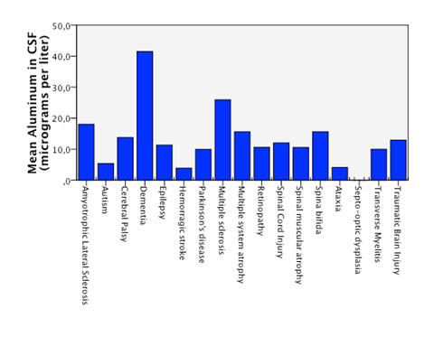 Aluminum is the most abundant metal on earth and is not known to have any biological metabolism in any living species.1 On the contrary, several studies have described its toxicity to the organic system although the mechanism is not fully understood.2-7 The deleterious effect of this metal has been discussed for decades, the first time 40 years ago in an animal model.8 with several studies linking its presence in serum, cerebrospinal fluid (CSF) and central nervous system (CNS) to several neurodegenerative diseases (ND) such as Alzheimer´s disease (AD),5,9-15 and Amyotrophic Lateral Sclerosis (ALS).12,16-23 There have been previous correlations of other metals metabolism and neurodegenerative diseases that encourage the study of aluminum in CNS and its contribution in neurodegeneration.24-27 The chronic accumulation of aluminum in the CNS is the principal mechanism of toxicity proposed. In this process, small amounts of aluminum ingested over the years accumulate in the brain tissue and form deposits that activate apoptosis and promote degeneration that leads to neuron loss. This toxic effect has been described with injected and ingested aluminum in animal models by different authors14,28-32 and some factors have being described to determine the grade of neurotoxicity, such as age and renal function.33 Furthermore, there are groups already testing ways to protect neuronal tissue from the effects of aluminum.34,35 Despite the evidence that links aluminum to CNS damage, the controversy regarding the participation of aluminum in the physiopathology of neurodegenerative diseases remains. The fact that the aluminum industry has been and still is one of the most profitable industries worldwide may contribute to this lasting controversy. To support the hypothesis of aluminum contributing to neurodegeneration, we assumed that a measurement in CSF that is in direct contact and constantly exchanges substances with cerebral tissue, would provide a more accurate proof of the accumulation of aluminum in cerebral tissue. Furthermore, when correlating these levels with other non-neurodegenerative diseases (as a control group) and with the patients’ clinical status, the causality of aluminium can be better accounted for.