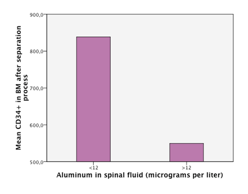 Figure 3 An empirical cutoff point in the sample was made (12 micrograms per liter). Patients with aluminum in CSF under 12 had higuer counts of CD34+ cells in BM (bone marrow) in the sample taken after the separation process of the cells.