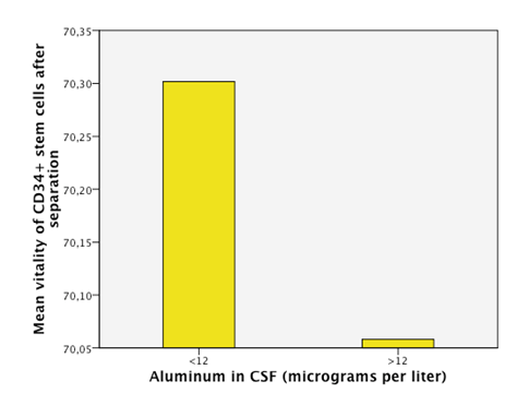 Figure 4 An empirical cutoff point in the sample was made (12 micrograms per liter). Patients with aluminum in CSF under 12 had higuer vitallity in the CD34+ cells of the BM (bone marrow) in the sample taken after the separation process of the cells.