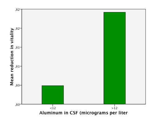 However, the lack of migrating capacity or functional deficiency, not measured but assumed by the low resistance to centrifuge, as well as the drastic reduction ofCD34+ cells/μl after separation in patients with high aluminum levels in CSF, probably cause an imbalance in tissue renewal. This deficient production of SC may be linked to the presence of aluminum in BM as an inflammatory factor, which means that leukocytes production and other inflammatory factors are activated and interfere in the migration capacity. These assumptions should be further confirmed by sampling SCs levels in the peripheral blood and BM of the same patient.46 Moreover, this analysis could identify BM as another possible indirect biomarker in some neurodegenerative diseases.Aluminum in the majority of patients regardless of their clinical diagnosis. Because of the toxic profile of aluminum, only aminimal presence of aluminum in CSF constitutes a potential harm. Furthermore, there is a clear prevalence of high aluminum levels in patients with neurodegenerative diseases, as has been shown by previous studies.8,11,13,14,20,28,30,32 We assumed that any aluminum presence in the CSF was abnormal and potentially hazardous to every person regardless of their diagnosis and health status. This study is the first description of a statistically significant relationship between high levels of aluminum in CSF and pathogenesis in humans with neurodegenerative diseases. There is an urgent necessity to allocate research funds supporting research on aluminum’s contribution to neurodegenerative diseases. Furthermore, studies with larger samples that include healthy control groups are needed in order to collect more information on aluminum neurotoxicity in humans and the development of diseases.