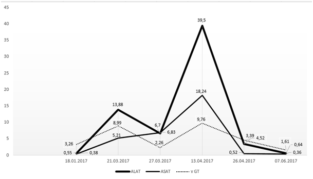 A 75-year-old male patient had maculopapulous exanthema in the gluteal region, as well as the extremities on 17.3.2017. The exanthema was non-itching and self-limiting the next day. General exhaustion, nausea and low appetite followed since 19.3.2017. The general practitioner had detected an increase in liver transaminases. Upon admission to our clinic he was fully conscious and not icteric. He had not stayed abroad since September 2016. Important in his medical history was well-controlled hypertension, treated with Valsartan 160 mg/die and Hydrochlorothiazide 12.5 mg/die. Furthermore, he underwent transsphenoidal pituitary surgery due to an endocrine inactive pituitary adenoma in 10/2003. Due to recurrence, stereotactic radiation therapy with 30 x 1.8 Gray was performed between 6-7/2004, leaving the patient panhypopituitaric. The present replacement therapy was levothyroxine 75µg daily, hydrocortisone 15-10-0 mg and testosteroneenanthate in a transdermalgel gel formulation with 25 mg daily. Non-alcoholic fatty liver disease [NAFLD] with a slightly elevated gamma glutamyltransferase [Gamma GT] in a range between 2-4 U/l [normal value < 1 U/l] and steatosis hepatis in ultrasound scan was a suspected diagnosis since the nineties, liver biopsy had not been done. Due to dyslipidemia, he was also treated with Simvastatin 40 mg/die since years. Although an unlikely culprit, this therapy was halted after admission. Physical examination showed an overweight [BMI 30kg/m2], non-icteric patient. He was normotensive and had a rhythmic heart action. He was normally hydrated and had no signs of exsiccosis. Furthermore, there were no pathological findings at the lung. The liver was enlarged, not painful. The neurological examination was normal.