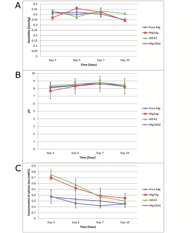 For pure Mg and Mg10Gd, osmolality was generally at a constant level up to day 7 (Figure 3A). After day 7, osmolality dropped for all the tested materials. For Mg2Ag, osmolality had already decreased after day 5. WE43’s osmolality values varied but the lowest osmolality value was reached at day 10.