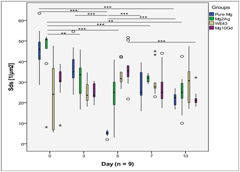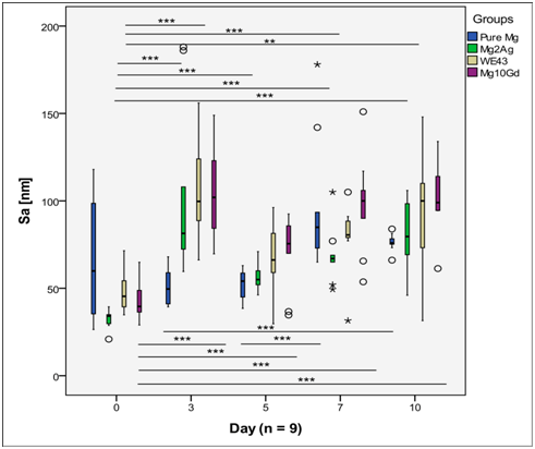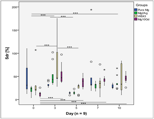 Sds of WE43 was quite constant over the observation period and no statistical differences were found between different observation points (Figure 6). For the other groups, Sds fluctuated and statistical differences between certain time points were found to be significant. Pure Mg and Mg2Ag had a similar pattern of surface change over time. For both of these materials, Sds decreased and reached its minimum at day 5. It then increased again at day 7 but started to fall until day 10, but this decrease was not significant. For Mg10Gd, Sds was minimal at day 3 and maximal at day 5, and then decreased until day 10.