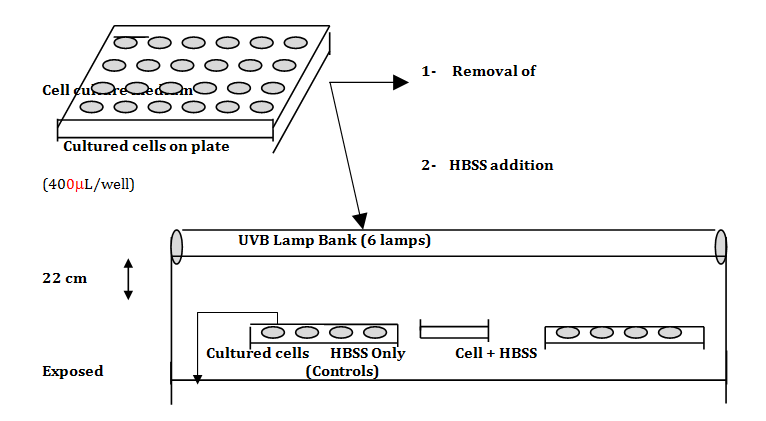 It should be noted that the distance from the light source to the exposed cell was 22cm in this experimental setting. In the experimental approach adopted UVB exposure was divided into low and high doses based on the length (T) of exposure.