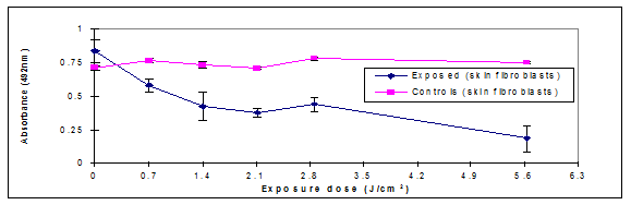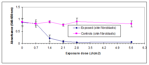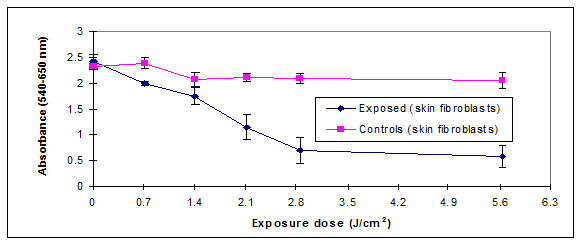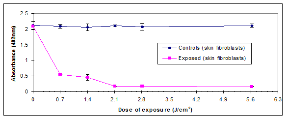 The experimental investigations used skin fibroblasts cultures at a density of 50,000 cells/100ml of media (5% fetal calf serum 3% antibiotics) exposed to UVB doses (0-5.6 J/cm2) with damage levels assessed by two cytotoxicity assays (Figure 1).