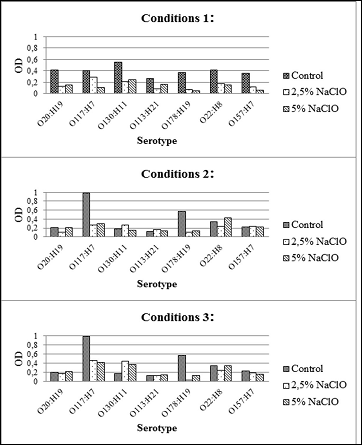 Each STEC strain was classified in different categories of biofilm formation according to the incubation conditions (Table 1). Respect to the different conditions tested, data showed that with the condition 1, hypochlorite sodium decreased the biofilms formation in both concentrations (Figure 1). In the conditions 2 and 3, the biofilm formation was affected more variably. Furthermore, in condition 2, the STEC strains O130, O113 and O157 formed more biofilm with the addition of 2.5% NaClO (Figure 1). Despite the interventions carried out with the disinfectant, a complete elimination of the biofilms was not observed. It was notable that the strains could develop biofilm, although with lower OD values, even in the presence of hypochlorite during 48h (Figure 1). On the other hand, the application of the disinfectant by 20 min on a biofilm formed did not produce a total decrease in OD values, although the greatest reducing effects were observed on biofilms of 24 h of incubation (Figure 1).