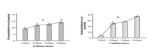 Figure 1 Effects of cadmium on plasma (A) and erythrocyte (B) malondialdehyde levels. Each bar represents the mean ± S.E.M of rats. Bars with different alphabets are significantly different at p<0.05.
