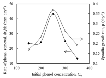 Two strains of microalgae, namely Chlorella sp. and Tetraselmis sp., obtained from a local marine research center in Umm Al-Quwain, UAE, were grown in Bold Bassel medium (3N-BBM)10 containing different concentrations of phenol (150-350ppm), as the sole carbon source. The growth mixtures were placed in shaking water bath (LabTech, DaihanlabTech Co. ltd., Koreas) set at 30 °C and 70 rpm and subjected to high illumination by four LED lights. At regular intervals, aliquots were withdrawn, and the biomass content was determined from the optical density measured at 680 nm using UV-spectrophotometer (UV-1800, Shimadzu, Japan). The biomass was then removed by centrifugation at 6000 rpm for 10 min using multispeed centrifuge (IEC CL31, Thermo Scientific, USA), and the phenol concentration in the supernatant was determined using a calibrated high-performance liquid chromatography, HPLC (Shimadzu, Japan). All experiments were carried out in duplicates, and the results presented are the average values. To eliminate any other reason which could also contribute to the drop in phenol concentration, the experiment was repeated at identical condition, except with absence of microalgae. A negligible drop in phenol concentration was observed, which proves that the drop was mainly biological by the microalgae. The drop in phenol concertation and the biomass growth were determined for both strains, and the results were used to determine the rate of phenol removal and specific growth rate, as shown in Figures 1 & 2, for Chlorella sp. and Tetraselmis sp., respectively. The performance of both strains was very close, both growing well in media of high concentrations of phenol, with a good ability to degrade the phenol. It was found the growth rate of microalgae, and the phenol drop rate, increased as concentration of phenol increased until the latter reached 250ppm. After that, both growth degradation rates decreased suggesting the effect of substrate inhibition of phenol.