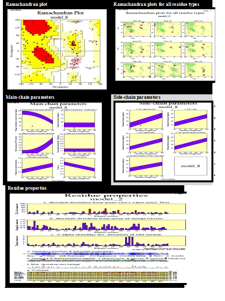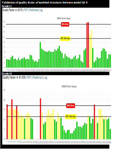 Model validation completed with the help of SAVES server. It is type of online web server for model validation and for analyzing protein structure for validity and assessing how correct they are it’s based on six programs Results: the Model 1 is pass by the SAVES server as per selection of model numbers we analyze the quality factors of model number one & eight for potential selection and analysis (Table 5).