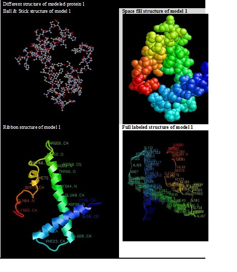 Selected model analysis based on 2D and 3D structure visualization and the model visualization completed with the help of different type of software’s for example: Chimera, Rasmol, and discovery studio computational predicted models via bioinformatics approaches and the method of homology modelling is based on the observations because that’s protein tertiary structure is better conserved than amino acid sequence (Table 6).