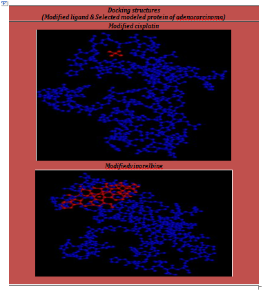 Finally in this study we modified cisplatin & vinorelbine chemical structures via online available tools on behalf of CADD parameters and 3Dstructure of Adenocarcinoma protein (homo sapience) which is predicted through the Insilico approaches and homology modeling and the docking of Modified cisplatin & vinorelbine with other selected various ligand and determined the interaction between protein and ligand that’s bind on active site of the Modified cisplatin & vinorelbine, although docking process. It is very complicated because its depends on various parameters the main resultant obtained by different type of docking tools and docking completed with the help of HEX,PATHADOCK for identify the suitable Modified cisplatin & vinorelbine and other different ligands which are docked with the Adenocarcinoma protein for inhibit the growth of unnatural cell development . Only 2 numbers of ligand given the minimum energy out of other selected 10 ligands. Modified cisplatin & vinorelbine is playing an important role as inhibitor for treatment of Adenocarcinoma with minimum binding energy and its work as a potential Inhibitor for unnatural cell development in lungs that causes Adenocarcinoma as per the Table number 9 & 10 parameters. Perhaps the ultimate solution is to develop a potential drug candidate against this devastating unnatural cell development in lungs that causes Adenocarcinoma.20