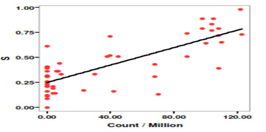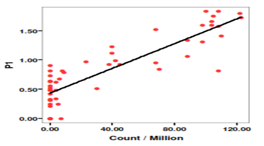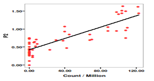A second statistical significant positive correlation existed between count/ml in million and PRM1, PRM2 and SEMG1 levels (r=0.842, r=0.810 and r=0.687 respectively and p<0.000** for all) as shown in Figure 2-4 respectively.
