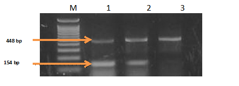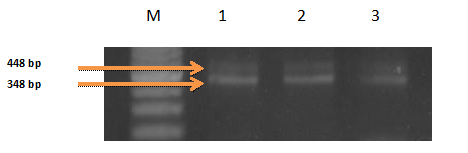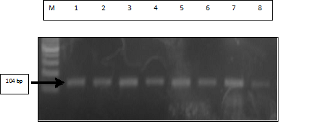 PCR product yielded a 333bp fragment on 1.5% agarose gel electrophoresis using 100bp DNA ladder (Jena Bioscience, Germany) as recorded by the gel documentation system.