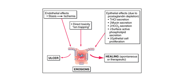 Aspirin and its metabolite salicylic acid irritate gastric mucosa and cause epigastralgia, nausea, and vomiting. In higher doses it also stimulates CTZ. Aspirin (pKa 3.5) remains unionized and diffusible in the acid gastric juice, but on entering the mucosal cell (pH 7.1) it ionizes and becomes indiffusible. This “ion trapping” in the gastric mucosal cell enhances gastric toxicity. Further, Aspirin partial contact with gastric mucosa promotes local back diffusion of acid, respectively focal necrosis of mucosal cells and capillaries, acute ulcers, erosive gastritis, congestion, and microscopic haemorrhages. The occult blood loss in stools is increased with any dose of Aspirin, averaging 5ml/24h at anti inflammatory doses. .Soluble Aspirin tablets containing calcium carbonat+citric acid and other buffered preparations have less gastric toxicity Use of NSAIDs increases risk of having a range of gastrointestinal (GI) problems13 When NSAIDs are used for pain management after surgery they cause increased risk of kidney problems. The mechanism by which NSAIDs may induce mucosal injury has been illustrated in Figure 1. The mechanism involves endothelial effects, epithelial effects, direct toxicity ion trapping, ulcer and erosion.13