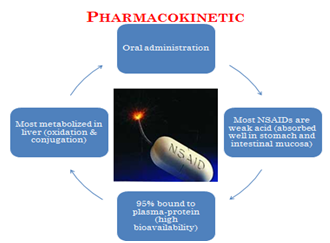 Most nonsteroidal anti-inflammatory drugs are weak acids, with a pKa of 3-5. They are absorbed well from the stomach and intestinal mucosa. They are highly protein-bound in plasma (typically >95%), usually to albumin, so that their volume of distribution typically approximates to plasma volume.30 Most NSAIDs are metabolized in the liver by oxidation and conjugation to inactive metabolites that typically are excreted in the urine, though some drugs are partially excreted in bile. Metabolism may be abnormal in certain disease states, and accumulation may occur even with normal dosage. Ibuprofen and diclofenac have short half-lives (2-3 hours).30 Some NSAIDs (typically oxicams) have very long half-lives (e.g. 20-60 hours).The pharmacokinetics profile of NSAIDs is illustrated in Figure 3, and as indicated for oral administration of NSAIDs most NSAIDs are weak acids and absorbs well in the stomach and intestinal mucosa. They are also metabolized in the liver by oxidation and conjugation, and 95%.bound to plasma protein, with high bioavailability.29,30