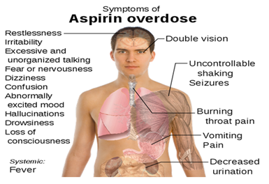 Aspirin in high dose reduces renal tubular excretion of urate (both substances are transported by the same mechanism). As analgesic (300 to 600mg during 6 to 8h) for head-ache, backache, pulled muscle, toothache, neuralgias as antipyretic in fever of any origin in the same doses as for analglesia. However, paracetamol and metamizole are safer, and generally preferred. Acute rheumatic fever Aspirin is the first drug of choice. Other drugs substitute Aspirin only when it fails or in severe cases. Antirheumatic doses are 75 to 100mg/kg/24h (resp. 4–6g daily) in the first weeks. Rheumatoid arthritis Aspirin a dose of 3 to 5g/24h after meal is effective in most cases. Since large doses of Aspirin are poorly tolerated for a long time, the new NSAIDs (diclofenac, ibuprofen, etc.) in depot form are preferred. Aspirin therapy in children with rheumatoid arthritis has been found to raise serum concentration trans-aminases, indicating liver damage. Most cases are asymptomatic but it is potentially dangerous An association between salicylate therapy and “Reye’s syndrome”, a rare form of hepatic encephalopathy seen in children, having viral infection (varicella, influenza), has been noted. Aspirin should not be given to children under 15 years unless specifically indicated, e.g. for juvenile arthritis (paracetamol is preferred). Postmyocardial infarction and poststroke patients by inhibiting platelet aggregation in low doses (100mg daily) Aspirin decreases the incidence of reinfarction.1,7 Aspirin overdose symptoms ranges from double vision, uncontrollable shaking siezures, excessive and unorganized talking fear or nervousness as indicated in Figure 4. Aspirin overdose can lead to symptoms ranging from restlessness double vision, fear and nervousness, systemic fever and others as indicated in Figure 4.