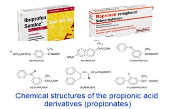 This is a derivative of phenylpropionic acid. In doses of 2.4g daily it is is equivalent to 4g of Aspirin in anti-inflammatory effect. Oral ibuprofen is often prescribed in lower doses (<2.4g/d), at which it has analgesic but not antiinflammatory efficacy. It is available in low dose forms under several trade names (e. g. Nurofen®–film-tabl 400mg). A topical cream preparation is absorbed into fascia and muscle. A liquid gel preparation of ibuprofen provides prompt relief in postsurgical dental pain. In comparison with indometacin, ibuprofen decreases urine output less and also causes less fluid retention. It is effective in closing ductus arteriosus in preterm infants, with much the same efficacy as indomethacin.30