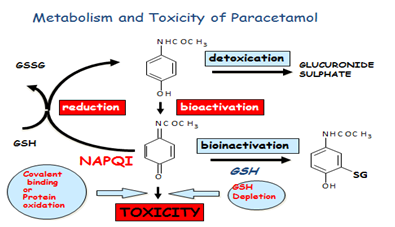This occurs especially in small children who have low hepatic glucuronide conjugating ability. If a large dose (>150mg/kg or >10g in adult) is taken, serious toxicity can occur as shown in Figure 5. On the metabolism and toxicity of paracetabol. The letal dose is 250mg/kg. N-acetyl-p-benzoquinoneimine (NABQI) is a highly reactive arylating metabolite of paracetamol which detoxicated by conjugation with glutathione. When a very large doses of paracetamol are taken, the glucuroconjugation capacity is saturated, more NABQI is formed, hepatic glutathione is depleted and NABQI binds covalently to proteins in liver cells (and renal tubules) causing necrosis. In chronic alcoholics even 5-6g/d taken for a few days can result in hepatotoxicity because ethanol induces CYP 2E2, that metabolizes paracetamol, to NABQI. Treatment needs activated charcoal, given orally or through the tube to prevent GI absorption, and acetylcysteine (150mg/g by i.v. infusion).