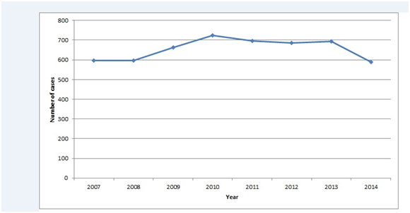Most cases of poisoning with benzodiazepines occur in women between the ages of 30 and 44 years. In men, the greatest number of poisonings occurred between the ages of 15 and 29 years. Regarding mortality, there was a higher incidence of death in men between the ages of 45 and 59 years. Figure 3 shows the percentage of cases that occurred during the study, according to age and sex. Attempted suicide is the primary cause of poisoning, followed by accidental causes. During 2007 to 2014 occurred 2885 cases of attempted suicide with benzodiazepine poisonings and 579 of the poisonings with benzodiazepines were because of accidental causes. Other causes were: self-medication (386 cases), side effect to medication (323 cases), medication errors (276 cases) and addiction (106 cases).