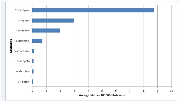 Figure 2 Average rate of drug poisoning with each benzodiazepine per 100,000 inhabitants in Costa Rica from 2007 to 2014.