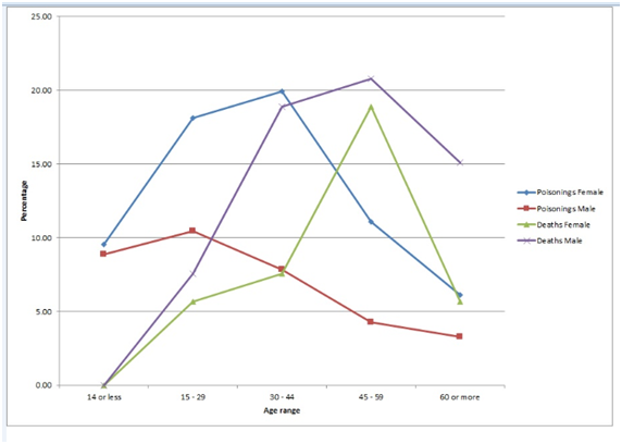 Figure 3 Age range and sex in cases of poisoning and deaths caused by poisoning with benzodiazepine in Costa Rica from 2007 to 2014.