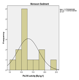 The radioactivity is everywhere in the earth including the human body. All radioactive sources emit radiations which cause biological damage to the human population. Among the varies radiation sources natural background radiations are important. The naturally radiation comes from terrestrial and cosmic rays, which is derived essentially from the 238U and 232Th series and single occurring 40K. The concentration of radionuclides from terrestrial sources changes with locations and altitude. The average dose rate received by population was value of 2.4mSv per year.1 Among the naturally occurring radionuclides 210Pb is a member of 238U series, which results from the intermediate decay of 226Ra to the noble gas, 222Rn by alpha disintegration. It also comes from the wet precipitation or dry deposition of 222Rn. This atmospheric addition of 210Pb is in excess of the amount supplied by the in situ decay of 226Ra. Background or supported 210Pb is assumed to be in equilibrium with the decay of 226Ra without the negligible loss of radionuclides. Lead-210 is highly reactive and is readily scavenged by organic matter and clay particles, but under anoxic conditions, 210Pb can be released back to the water column. 210Pb is removed from the water column to the sediment by scavenging. Chemical adsorption onto particulate matter facilitates transport over long distances before its final deposition in the sediment. The activity of 210Pb at the sediment surface is the result of interplay between accumulation, sediment mixing, and radioactive decay. Therefore, it is important to understand the concentration and behavior of lead in an aquatic environment. The published data on 210Pb in aquatic environs is important and so an attempt was made in the present investigation to study the Seasonal variation of 210Pb in the soil and sediment of Hemavathi River environ. Seasonal variations are important to understand the behavior of 210Pb activity with different seasons, because of heavy rain fall in rainy season and high temperature in pre-monsoon may affects the changes in activity concentration.