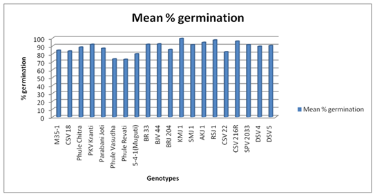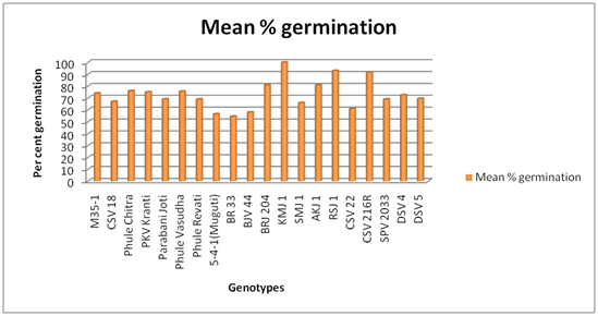 The genotypes KMJ 1(99.50%), RSJ 1(97.50%), CSV 216R(96.00%) and AKJ 1(94.50%) have shown maximum germination percentage under uninfested condition and also the same genotypes performed well by showing (100.00%), (93.00%) and (91.50%) highest germination percentage respectively even after four months infestation period. However under uninfested condition the genotypes Phule Revati (73.00%), Phule Vasudha (73.50%), 5-4-1(80.00%) and CSV 22(82.50%) have recorded significantly lower germination percentages where as under infested condition BR 33(54.50%), 5-4-1(56.50%), BJV 44(58.00%), CSV 22(61.00%), SMJ 1(66.00%) and CSV 18 (67.00%) have recorded minimum germination. The maximum seedling vigor index was recorded in M 35-1(3448) in both uninfested and (2649) infested conditions and at the same there was reduction in germination by 0.54 per cent for every one per cent increase in population buildup of rice weevils and the values are significant at 5 per cent.