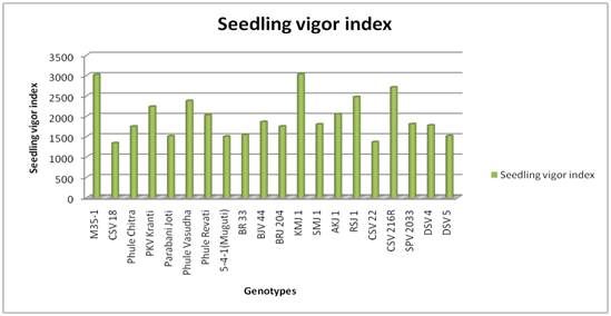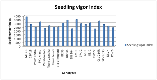 The seedling vigor index of the sorghum genotypes under damaged condition are recorded and significantly highest was noticed in the genotype M 35-1(2649), where as the minimum was observed in CSV 18(1005). The rest of the genotypes showed vigor index between the range 1061 and 2530. All the treatments differed significantly with each other.