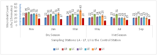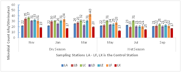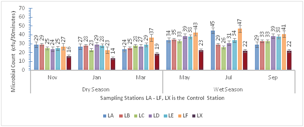 Figure 1 presents results of the spatial and seasonal distribution of bacterial aerosols. Results showed that bacterial bioaerosols ranged from 40–73cfu/30 minutes, with lowest values in the control station (LX). Based on seasonal variation, higher bacterial counts were reported in dry season compared to wet season. Furthermore, lowest bacterial count was reported in the month of May at station LD, highest bacterial count was reported in the month of November at station LF (Figure 1).